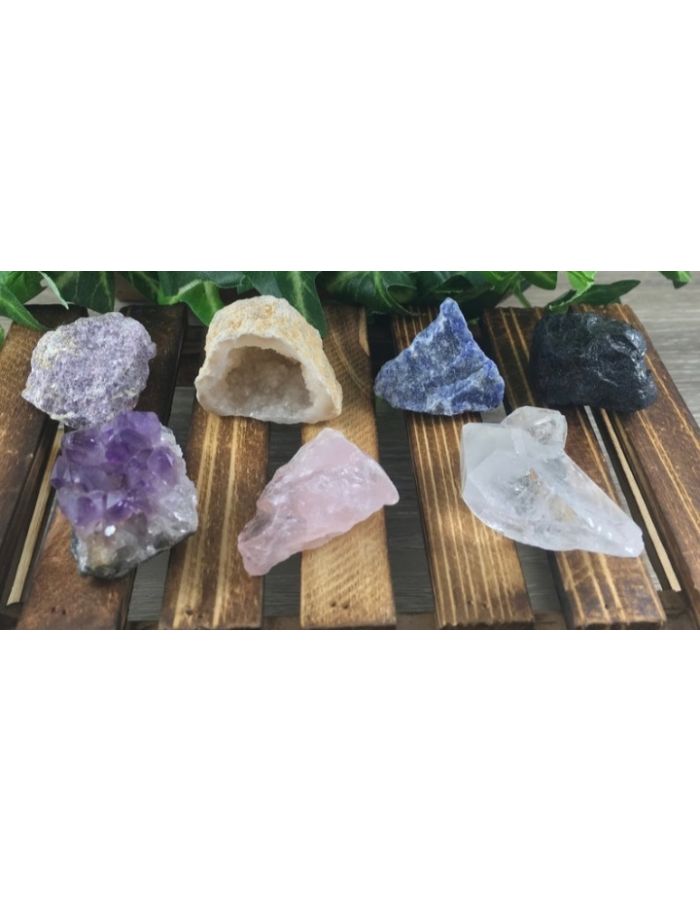 7 wonders gemstone - clear crystal, rose quartz, amethyst, black tourmaline , agate geode , sodalite, lipidolite