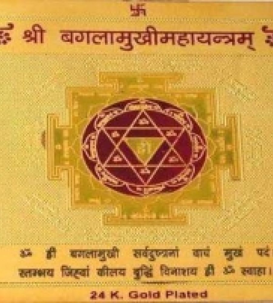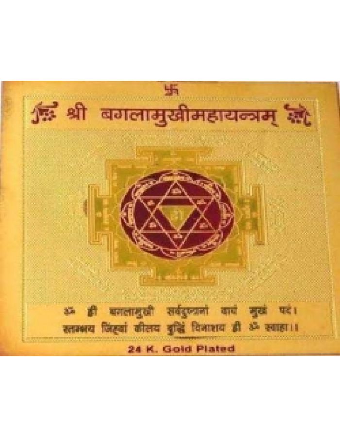 Baglamukhi Yantra provides you protection from the evil intentions of your enemies. This Yantra helps you to become more successful professionally. This Yantra helps you to improve your financial condition. Baglamukhi Yantra removes all negative energies from your surroundings. Yantra - Rudraksha Ratna Benefits: · Protection from mishaps, negative eyes and negative energies · Victory from opponent especially in legal matters and competitions · Pacifies quarrels .Worshipping Baglamukhi Yantra is beneficial for victory over enemies especially in law suits - Presence of this divine yantra gives victory in competitions over competition This Baglamukhi Yantra also pacify quarrels to the worshippers advantage It is also beneficial for the removal of obstacles. One should keep this yantra for good health and prosperity. For divine grace and blessings of Maa Baglamukhi. Mata Bhagwati Baglamukhi stuns (Sthumbh make him a statue) the enemy and makes him unmovable as if the enemy has become a stone. She makes the enemy to not utter a single word against the devotee by holding his tongue tight and thereafter cutting it. Mata Baglamukhi hypnotises the enemies and steals his knowledge, wisdom, thus making him incapacitated to do any work. Mantra: Om Hlreem Bagalamukhi Sarvadushtaanaam Vaacham Mukham Padam Stambhay, Jihvyam Keelay Buddhim Vinashaay Hlreem Om Swaha ॐ ह्रीं बगलामुखी सर्व दुष्टानाम वाचं मुखम पदम् स्तम्भय, जिव्हां कीलय बुद्धिम विनाशय ह्रीं ॐ स्वाहा ।। Purpose: For victory over enemies, law suits, success in quarrels and competitions Worship Procedure of Yantra - First of all place the yantra on a yellow asan on chouki - Sit facing east direction - Bath the yantra with holy river water/ gangajal - Wipe it off with clean cloth Apply haldi and chandai tika of sandal paste on it and offer yellow flowers. Sadhak should sit on yellow woolen asan Chant mantra of god/ goddess with haldi mala - Show chandan Dhoop/ Agarbatti to Yantra and light a diya . Offer some yellow sweet, yellow fruits and other eatable to the yantra Speak out your wish loudly in front of the yantra