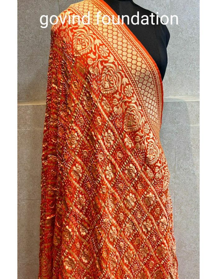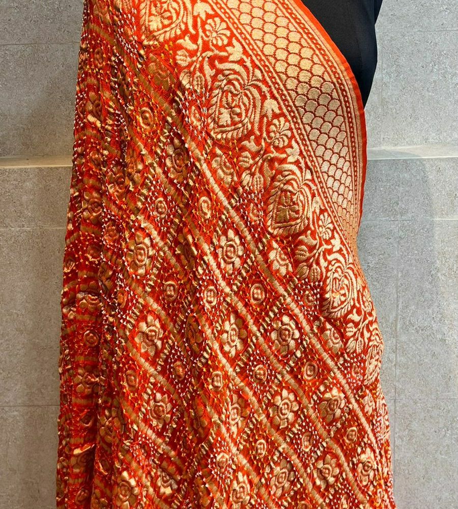 Beautiful Banarasi bandhni dupatta orange colour perfect for party and matching suit , lehanga and dresses This product has been woven by hand and may have slight irregularities that are a natural outcome of the human involvement in the process is a highly skilled technique where the fabric is elaborately tied & dipped in dyes to reveal a dotted design with bright patterns.Each item is handcrafted using the bandhani tie-dye technique, using 100% natural dye, and might carry variations of color (light and dark), patterns and other delicate inefficiencies.