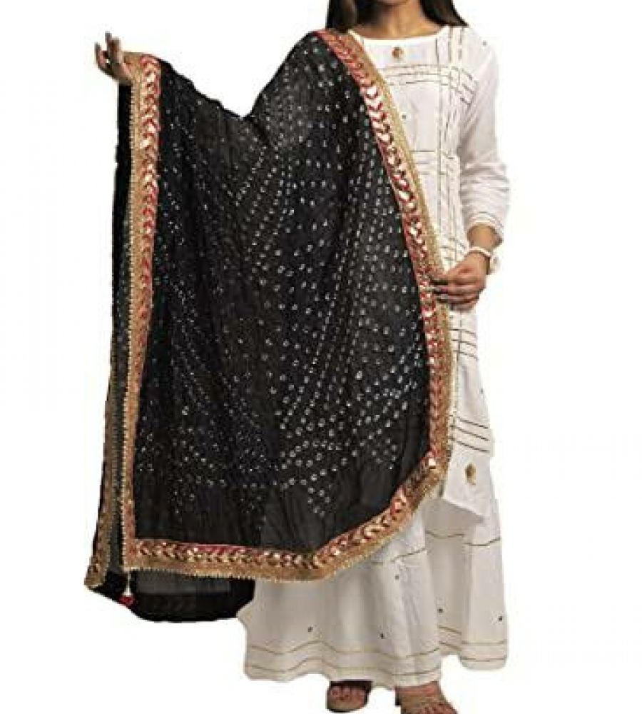 This bandhni black colour gota patti border dupatta has been woven by hand and may have slight irregularities that are a natural outcome of the human involvement in the process is a highly skilled technique where the fabric is elaborately tied & dipped in dyes to reveal a dotted design with bright patterns.Each item is handcrafted using the bandhani tie-dye technique, using 100% natural dye, and might carry variations of color (light and dark), .