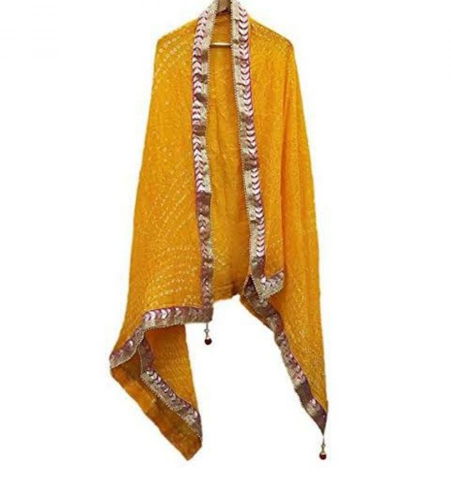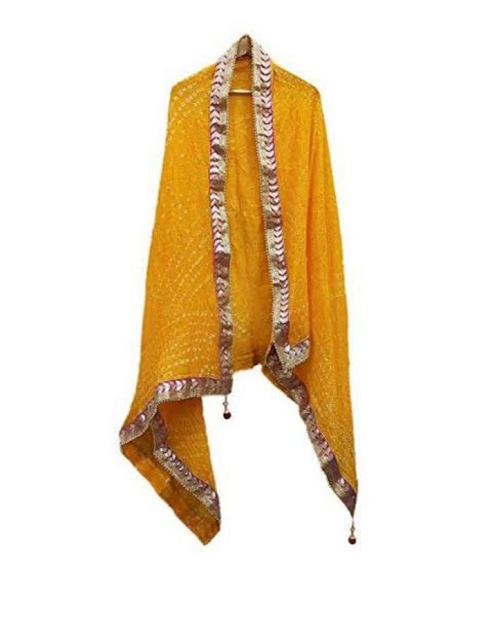 This bandhni yellow colour with gota patti border dupatta has been woven by hand and may have slight irregularities that are a natural outcome of the human involvement in the process is a highly skilled technique where the fabric is elaborately tied & dipped in dyes to reveal a dotted design with bright patterns.Each item is handcrafted using the bandhani tie-dye technique, using 100% natural dye, and might carry variations of color (light and dark), .