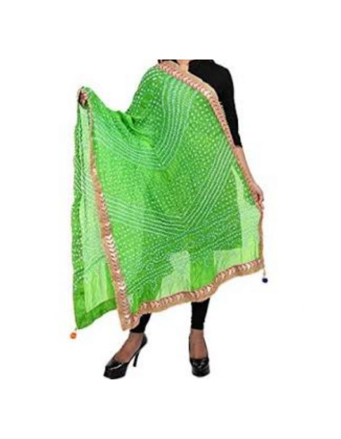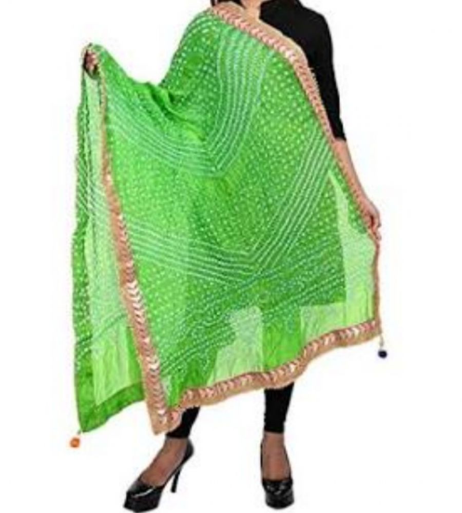 This bandhni with gota patti border dupatta has been woven by hand and may have slight irregularities that are a natural outcome of the human involvement in the process is a highly skilled technique where the fabric is elaborately tied & dipped in dyes to reveal a dotted design with bright patterns.Each item is handcrafted using the bandhani tie-dye technique, using 100% natural dye, and might carry variations of color (light and dark), .
