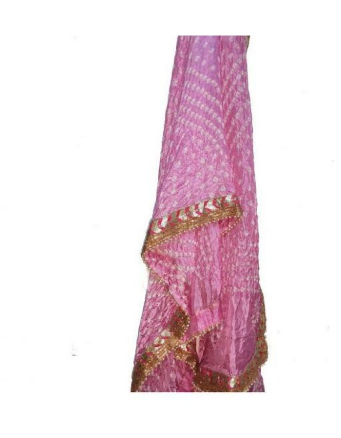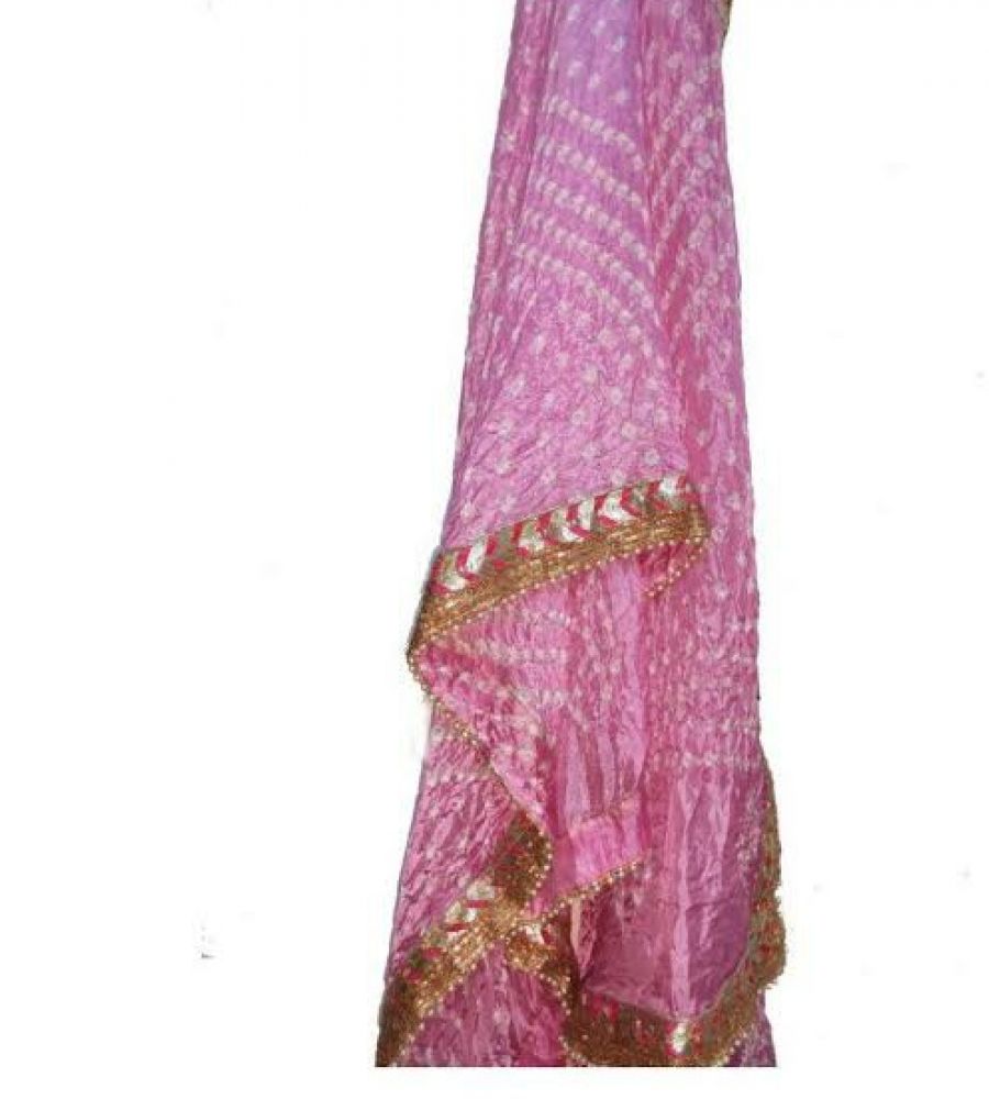 This bandhni pink colour gota patti border dupatta has been woven by hand and may have slight irregularities that are a natural outcome of the human involvement in the process is a highly skilled technique where the fabric is elaborately tied & dipped in dyes to reveal a dotted design with bright patterns.Each item is handcrafted using the bandhani tie-dye technique, using 100% natural dye, and might carry variations of color (light and dark), .
