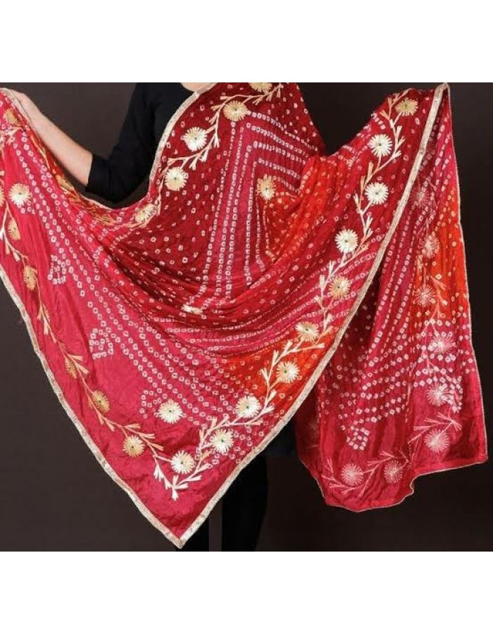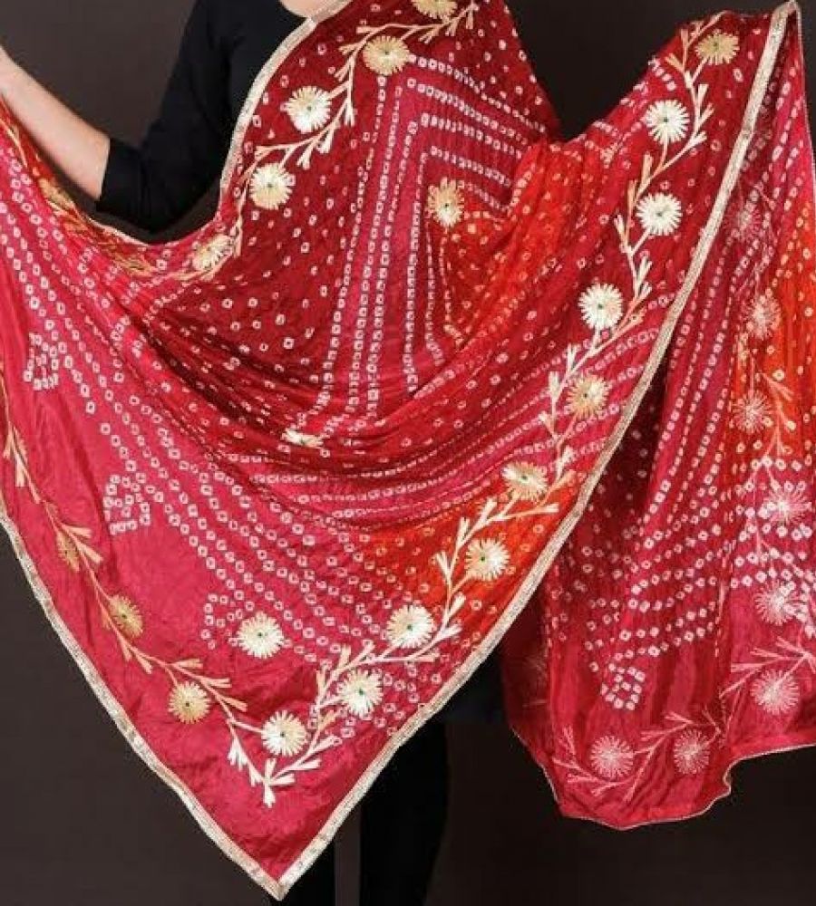This is handmade gota patti work on bandhni design beautiful work and perfect for party wear dress This product has been woven by hand and may have slight irregularities that are a natural outcome of the human involvement in the process is a highly skilled technique where the fabric is elaborately tied & dipped in dyes to reveal a dotted design with bright patterns.Each item is handcrafted using the bandhani tie-dye technique, using 100% natural dye, and might carry variations of color (light and dark), patterns and other delicate inefficiencies.