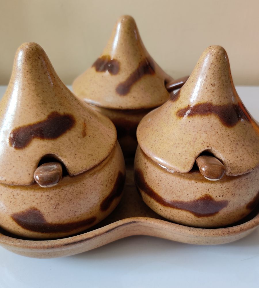 Beautiful ceramic pickle jar matka shape set of 3 with tray and spoon