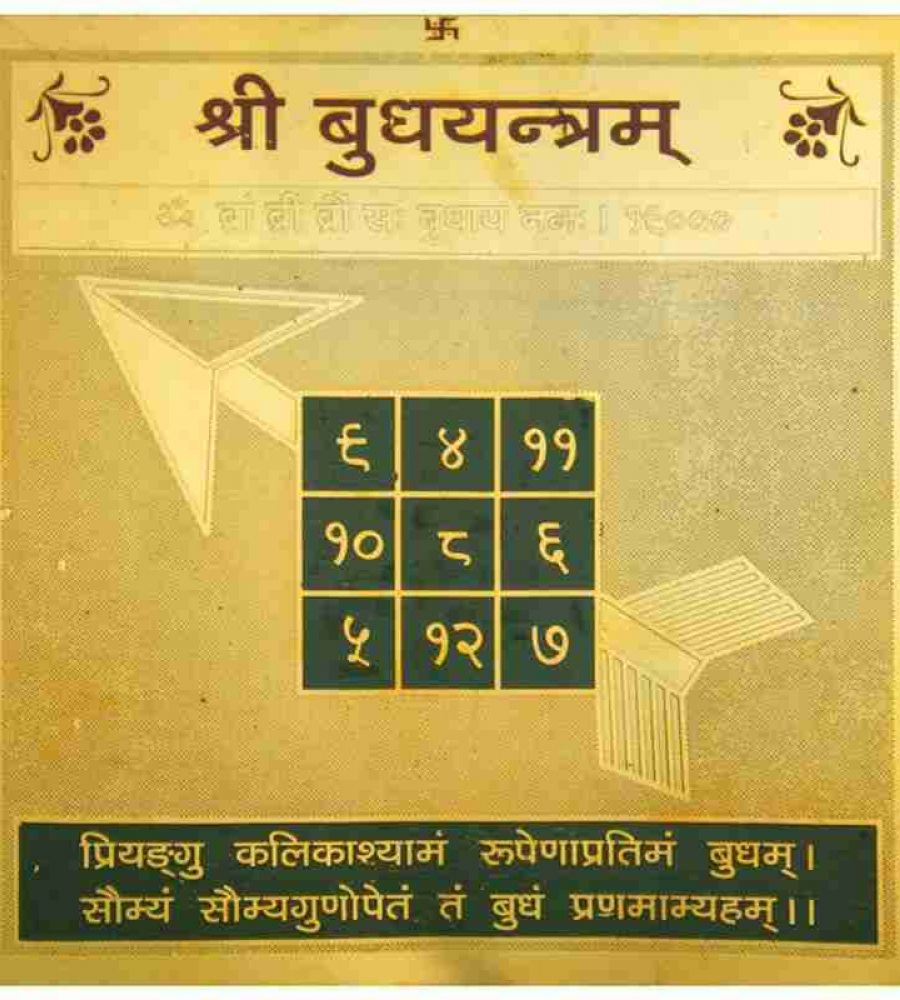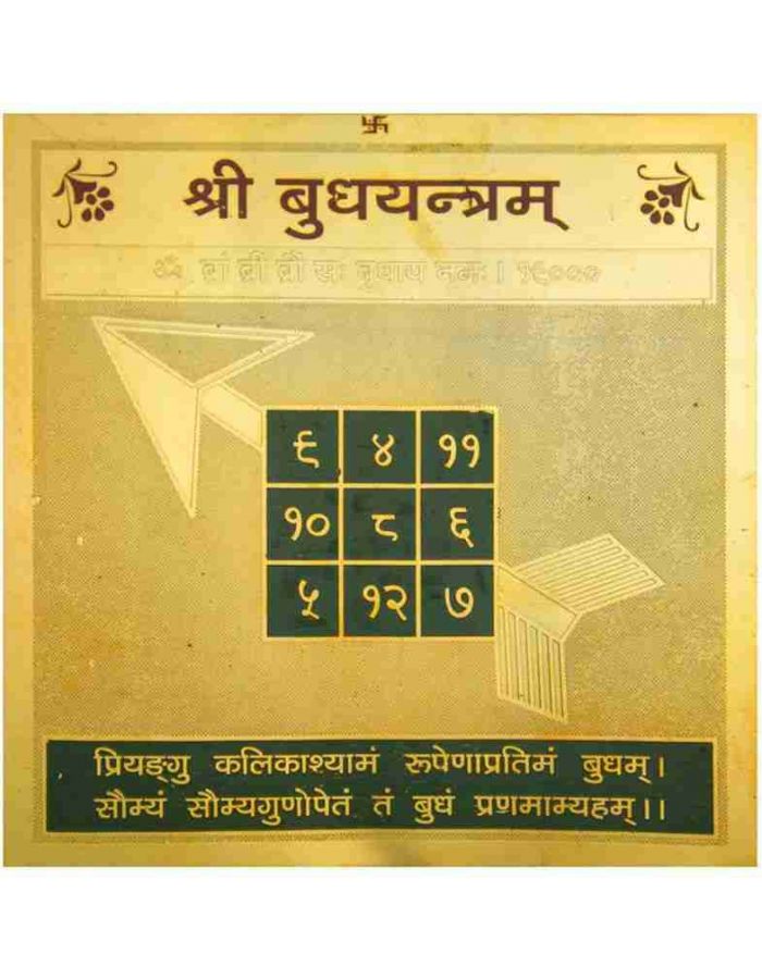 Budh Yantra pertains to planet Budh alias Mercury. You imbibe good positive qualities of Mercury Yantra. Siddh Budh Yantra works well to sharpen, intelligence and acquiring knowledge. You are able to take the right decision, set goals and achieve the same. It adds to your sense of creativity. You develop a good sense of humor and become kind of witty in conversation. Career oriented is to achieve higher growth and hold a very responsible position in a reputed organization. A business person succeeds is able to score over competitors and hold reputation in the market as a trustworthy business person. Siddh Budh Yantra leads to a healthy financial position and prosperity in life. Enhances communication skills, intelligence and creativity · Protects from all kinds of diseases and sorrows · Offers wit and presence of mind · Enhances ..This Budh Yantra is a sacred instrument that resonates with the powers & positive frequencies of planet Budh (Mercury). Mercury Yantra has the power to attract principles of God Budh and also carry the signification of a mantra. This yantra is a powerful yantra which resonates with the positive energies of the planet Budh and blesses the worshipper with polished communication skills, success, intelligence & rational thinking. Bhudha Mantra: Om Braam Breem Braum Sah Budhaye Namah बुधा मंत्र: ओम ब्रां ब्रीं ब्रौं सः बुधाय नमः