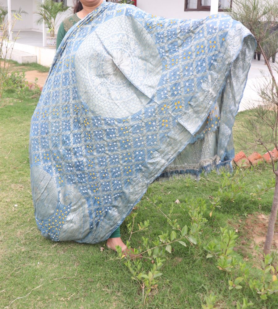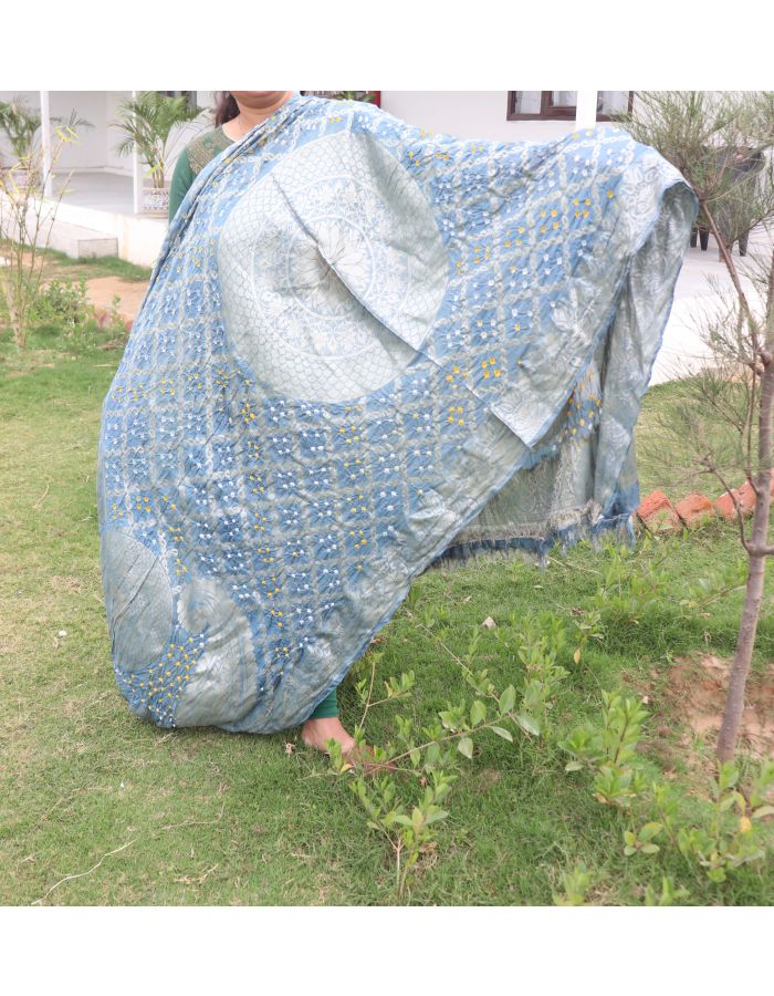 This gaji silk bandhni Banarasi pattern sea grey golden work dupatta has been woven by hand and may have slight irregularities that are a natural outcome of the human involvement in the process is a highly skilled technique where the fabric is elaborately tied & dipped in dyes to reveal a dotted design with bright patterns.Each item is handcrafted using the bandhani tie-dye technique, using 100% natural dye, and might carry variations of color (light and dark), .