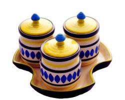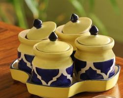 Pickle jar set Ceramic pickle jar set of 4 with tray blue yellow