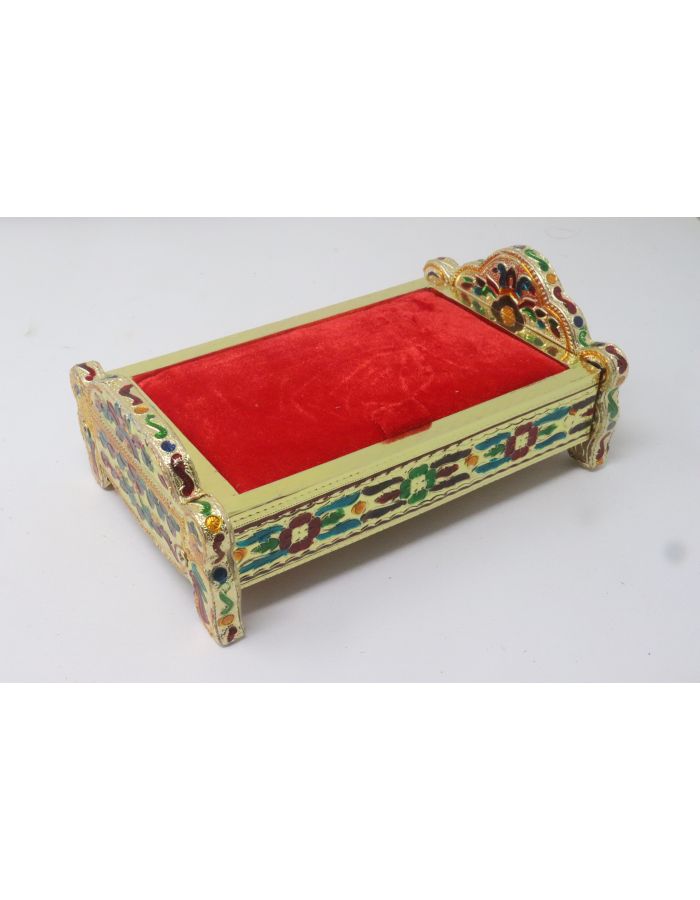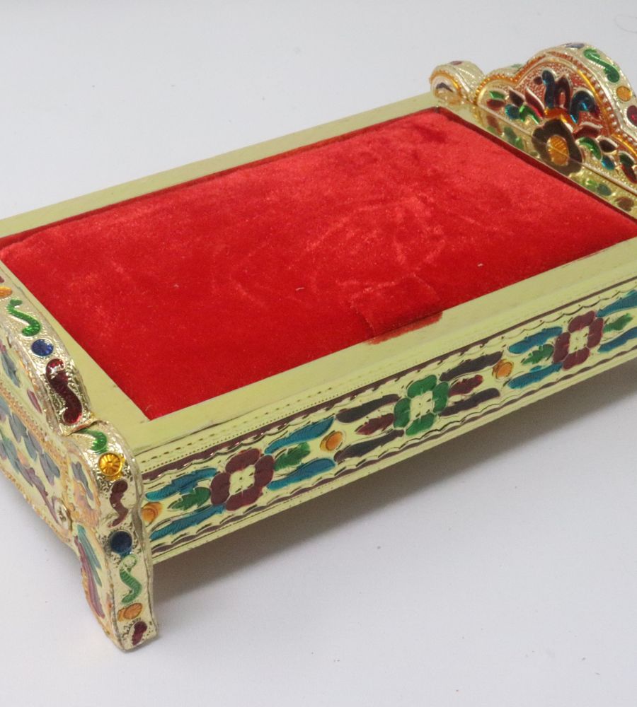 Wooden Handmade Decorated bed with mattress Lord Krishna/Laddu Gopal bed is specially designed for Bal Gopal. This Krishna bed made by good quality of wooden handmade handicraft work, beads Lace with color full beads work.. This attractive bed is perfect for Laddu Gopal. It is also wonderful gift for all special occasion.