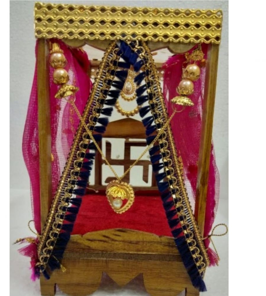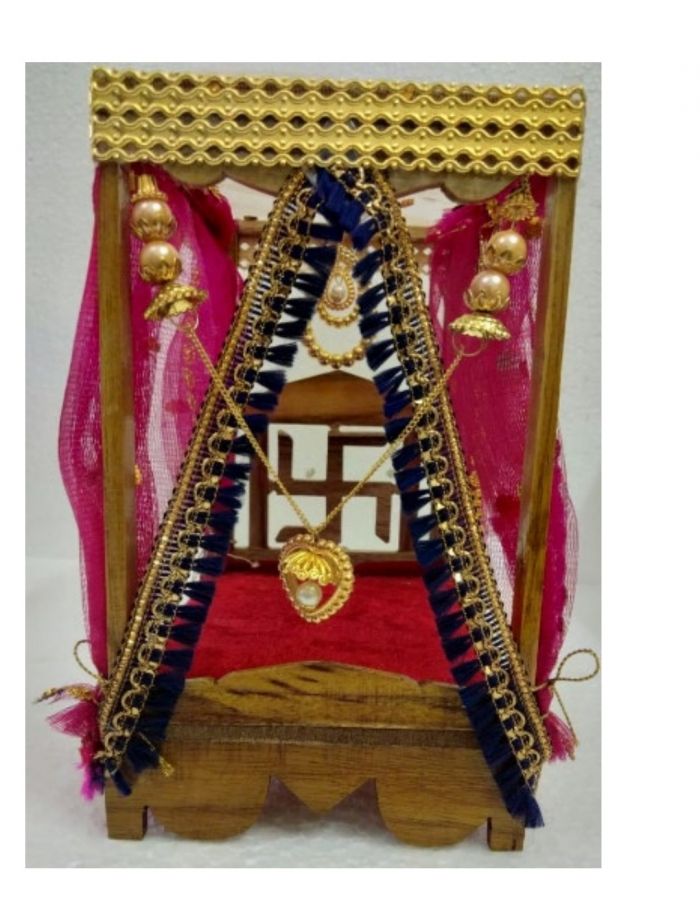 Wooden Handmade Decorated bed with mattress Lord Krishna/Laddu Gopal bed is specially designed for Bal Gopal. This Krishna bed made by good quality of wooden handmade handicraft work, beads Lace with color full beads work.. This attractive bed is perfect for Laddu Gopal. It is also wonderful gift for all special occasion.