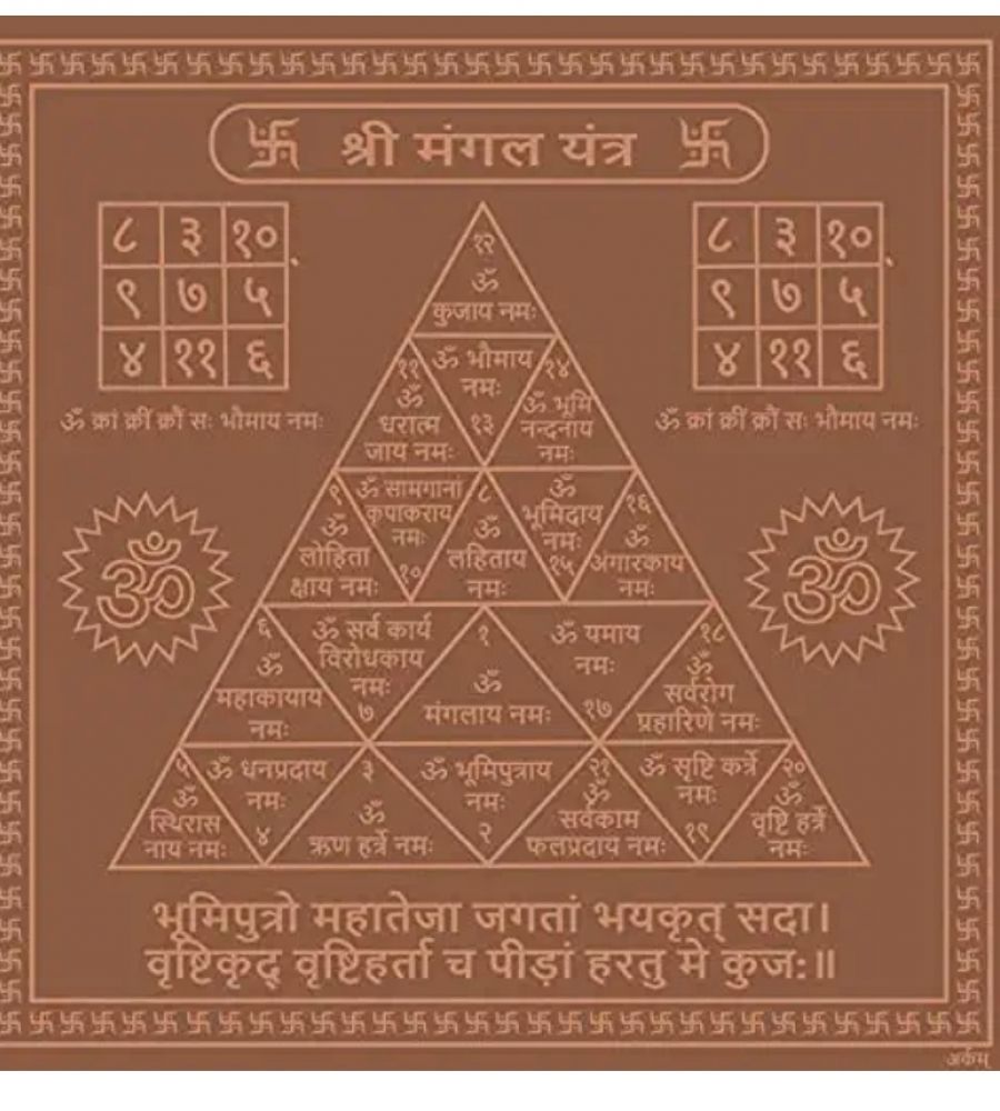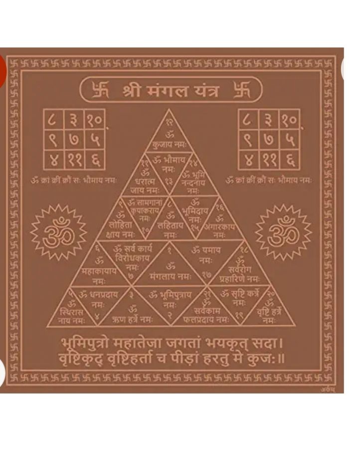 Mangal Yantra improves the auspiciousness of Mars and reduces its malefic effects. This Yantra is instrumental in getting free of debts. Mangla Yantra helps in protecting pregnancy ad a safe progeny. It helps in finding a suitable match and a fulfilling married life.When worshipped, it effectively alleviates malefic effects of Mangal Graha, brings prosperity, success in business, heals marital discord, helps to get rid of Mangal dosh in kundali. It is a very powerful and extremely helpful way of enjoying great results. It can easily save you from accidents, cures, diseases, anger and debts. You will overcome and enjoy quick recovery if you worship it every day. Mangal yantra is often known to keep your temper and problems at bay. However, girls are often told to worship this yantra if they reach a marriageable age. It is powers cosmic blessings. In case of any delayed marriage this yantra will diminish all your efforts to not enjoy a successful married life. Any kind of health worries like stroke, fever, tension, low and high B.P,