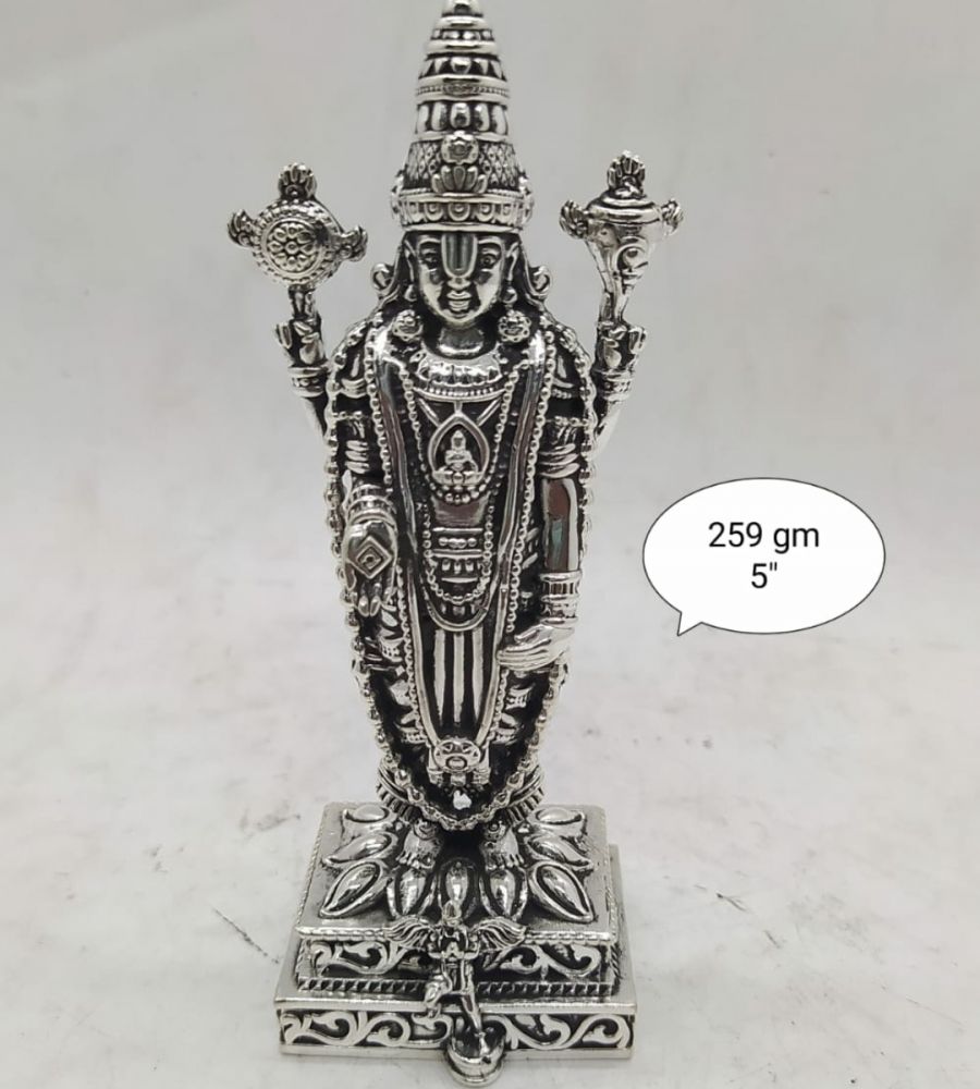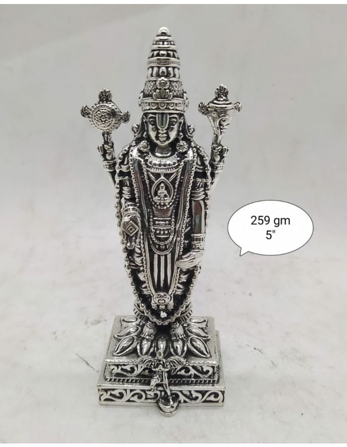 Sharp featured and clear finished pure silver idol of tirupati balaji we make all idol in purity of 95% with very good finishing and good looking our govind foundation is religious foundation so we make all idols with full devotion and faith .
