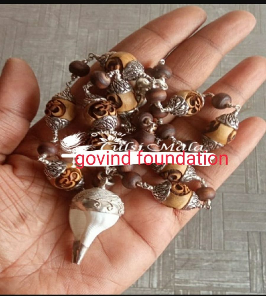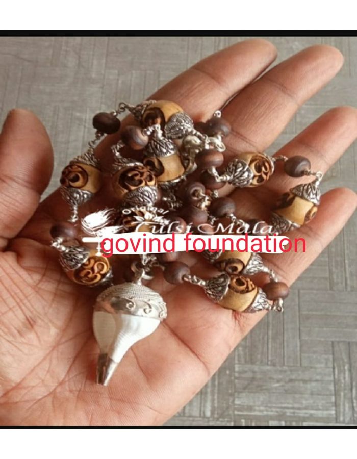 Design om carved on Tulsi beads with pure silver chain and caping with shankh locket with silver caping